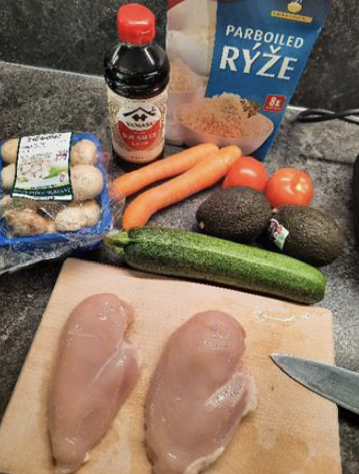 Kuřecí prsa si očistíme a nakrájíme na plátky. Plátky osolíme a okořeníme grilovacím kořením a pokapeme sójovou omáčkou. Prsa dáme na pánev a orestujeme. Mezitím si dáme vařit rýži podle návodu.